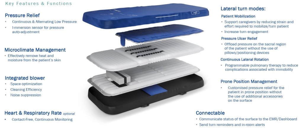 Therapy2 er háþróuð loftdýna sem er sérstaklega hönnuð fyrir gjörgæslu, skurðdeildir og þar sem sjúklingar eru í aukinni áhættu vegna hreyfingarleysis. Dýnan styður bæði við húðvernd og lungnameðferð með fjölbreyttum, sjálfvirkum stillingum sem bæta öryggi og draga úr vinnuálagi starfsfólks.