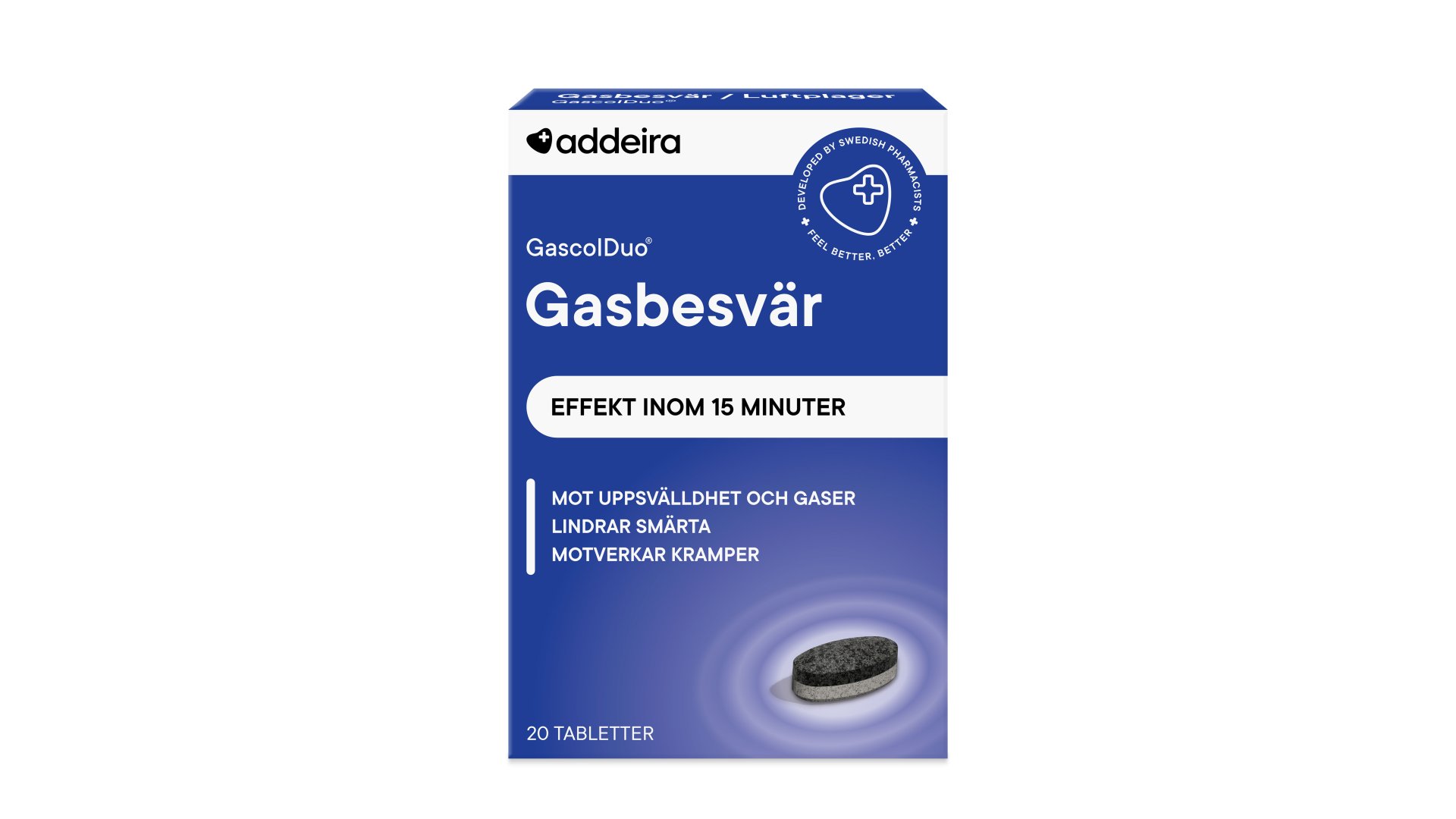 GascolDuo® veitir langvarandi krampa- og verkjastillingu hjá þeim sem glíma við uppþembu og vindgang með því að draga úr loftmagni í maga og þörmum. GascolDuo® er tveggja laga tafla, sem losar virku efnin í tveimur skrefum á leið sinni í gegnum meltingarveginn (tvískipt losun). Innan 15 mínútna losa töflurnar 50% virku efnanna í maganum, sem veldur því að þær hafa strax áhrif. Innan 1 klukkustundar er afgangurinn losaður, sem veitir langvarandi áhrif. GascolDuo® inniheldur hvorki laktósa né glúten sem þekkt eru fyrir að valda uppþembu.